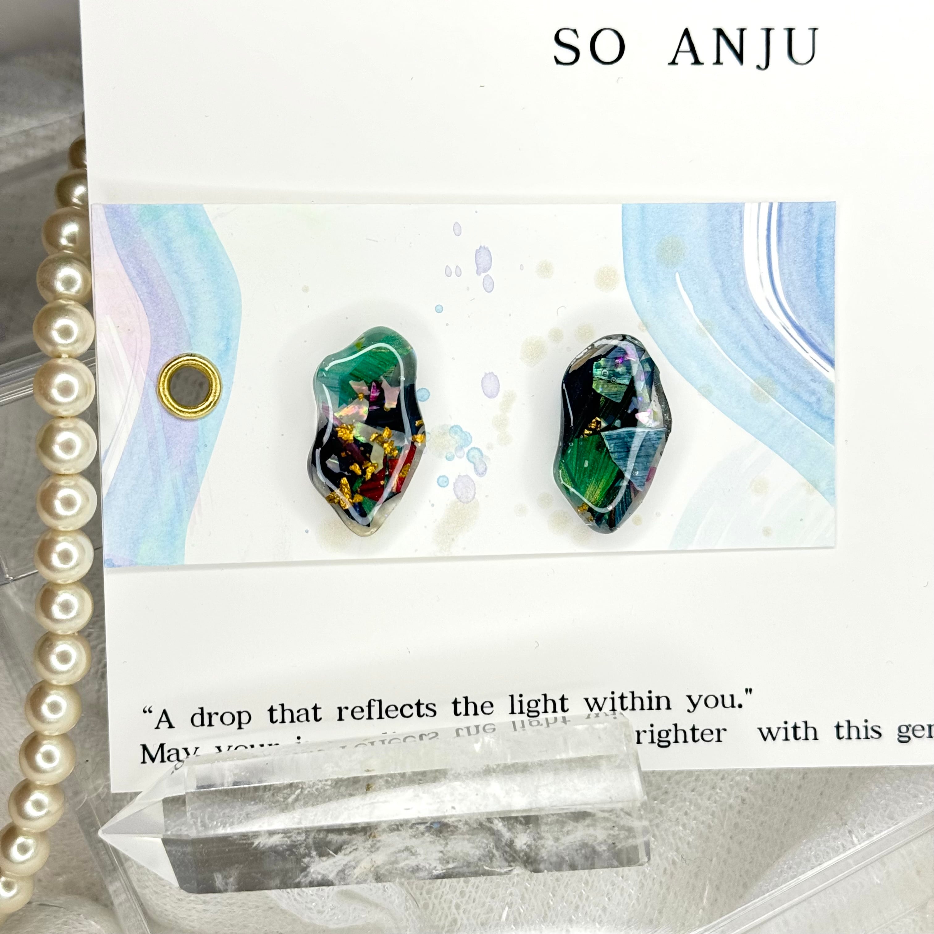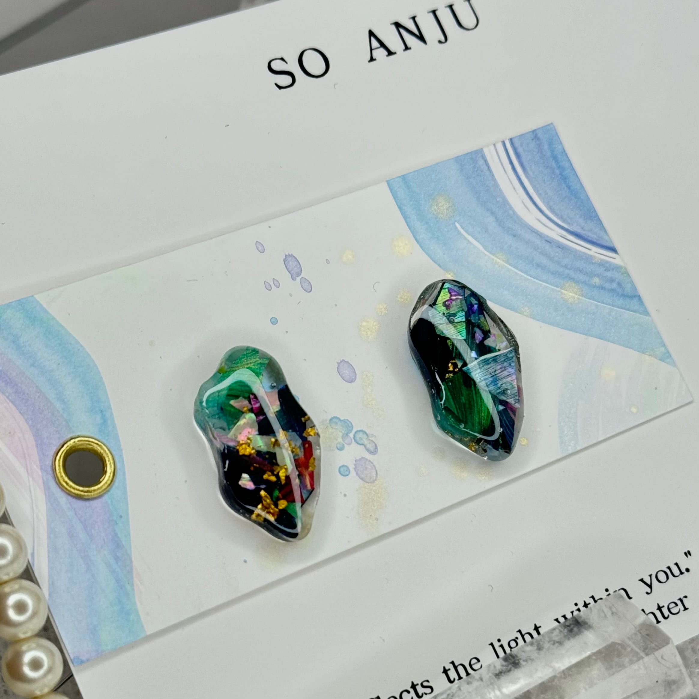 色が混ざり合う瞬間や、描く前の衝動のような時間をそのまま残すように、シェルやパールなどのパーツをを織り交ぜながら一点一点制作しています。